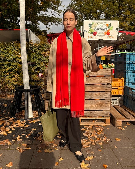» Red scarf from the Slow Label or Arket // Toteme car coat // Heidi Merrick sunnies (ARDASCHANDRA10) // LESET white LS T-shirt (size up) // V-neck grey cashmere sweater // MARA Pearl necklace // your vintage 501s or those denim jeans in the perfect wash (via NAP) // Mango leather brown ballet flats (true to size!) // Liffner Bucket bag (here via NAP) // 2026 planner // MERIT minimalist stick