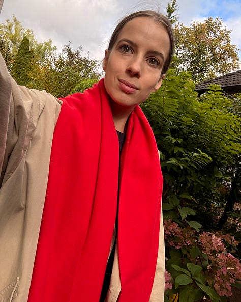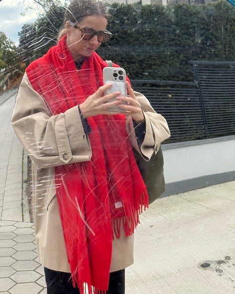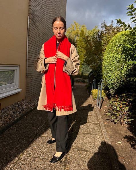 Oh! so soft, Oh! so warm, Oh! so red! Love at first sight. A bright red scarf as a pop of unexpected color. This is where I bought my scarf from (10% off when you sign up to their newsletter). The Slow Label is a small and independent European brand, founded by creator Anna-Laura Menta. The scarf is big — 200cm x 50cm — the perfect size to wear in so many ways. It also comes in beautiful neutral colors.