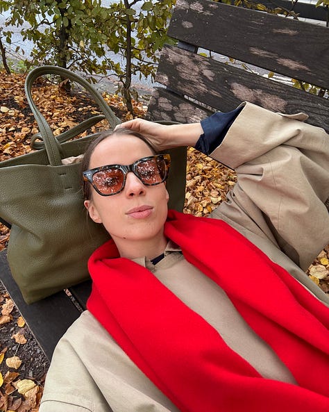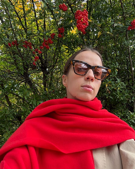 » CLÒIMH red scarf // Mango Selection Trench coat in dark olive // Heidi Merrick sunglasses (ARDASCHANDRA10) // COS merino wool cardigan from the men’s section (now you know my secret) // Dorsey gold necklace // The Slow Label Cami top every day top // The Horse green olive leather tote bag // any black trousers but this is good: 100% wool one from Massimo Dutti // Mango Leather brown ballet flats // MANTLE (the only skincare brand I buy and use) // MERIT mascara and bronze balm