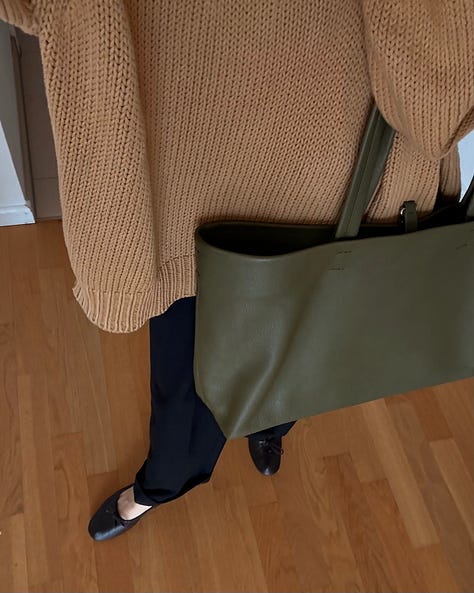I originally had the black one on my list, but I chose this shade because it feels richer and more interesting, as a styling tool. The bag is from The Horse and came from Australia (I did have to pay a small customs fee on top, just under 20€). It smells amazing, the shoulder straps are incredibly comfortable, and it’s surprisingly roomy with a small zipped pocket inside. Overall, it’s a beautiful shopper bag for under 300€, and it’ll be my personal item on my next flight, in just two weeks (guess where we’re going?)! This is my version of a Park Tote, for now (and maybe forever?)